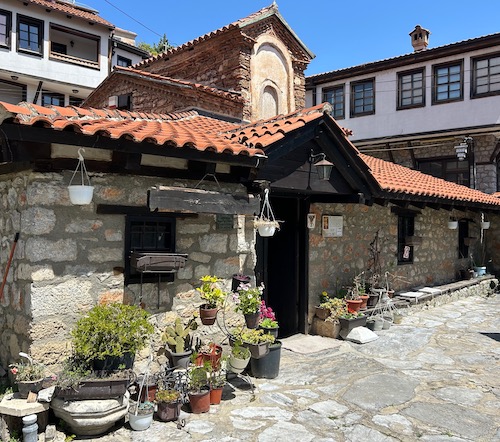 Met een taxi laten we ons naar de stad brengen en dwalen samen door het oude middeleeuwse gedeelte van Ohrid, op weg naar het kasteel op de heuvel. De klim is lang en steil en Marijke en ik haken voortijdig af.