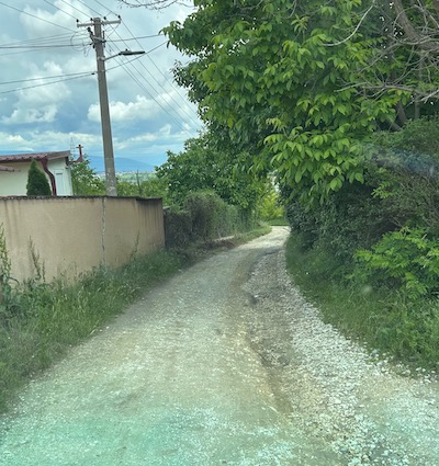Zo zijn wij kilometers over een onverharde weg door de bush gereden om één van de weinige campings in Noord-Macedonië te zoeken. Onderweg raken we Geert en Hammy kwijt. En net toen we besloten terug te rijden, kwam een man in een Toyota voorbij en dat bleek de eigenaar te zijn. Hij brengt ons naar de plek waar Geert en Hammy al staan. Een mooie plek maar absoluut niet geschikt voor campers: nauwelijks voorzieningen, geen rechte plek om te staan, weinig ruimte om te draaien, en een prijs die niet in verhouding staat tot wat men te bieden heeft.