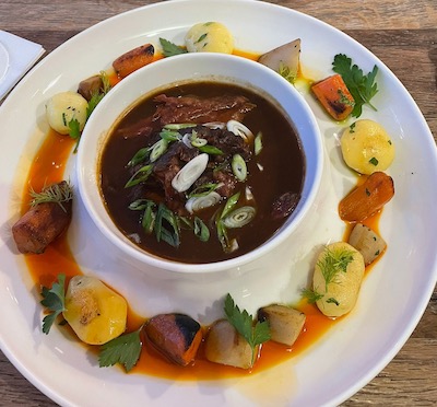 Het is guur en koud en hoewel we inkopen hebben gedaan om te koken, besluiten we toch maar om in het het restaurant te eten. Er is niet veel keuze: schnitzel met frites. Smakelijk, maar de porties zijn voor ons te groot. Dat hebben Geert en Hammy in Boedapest beter gedaan!