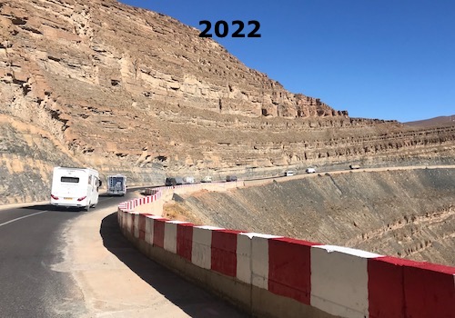 Vandaag rijden we in konvooi de prachtige weg door de Dades-kloof. De zeer scherpe haarspeldbochten en het grote stijgingspercentage vergt vooral van de grote campers enig stuurmanskunst.