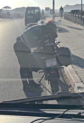Een fout in de hoogste categorie, hij bedoelt de duurste bekeuring die hij te bieden heeft. Oké, wij doen het niet voor minder: 40 euro! In Marokko een behoorlijk bedrag. Op het zadel van zijn motor worden alle papieren ingevuld. Marijke denkt ongezien een foto van de agent te kunnen maken, maar is toch gespot door een andere agent. Waar komen die kerels toch overal vandaan?