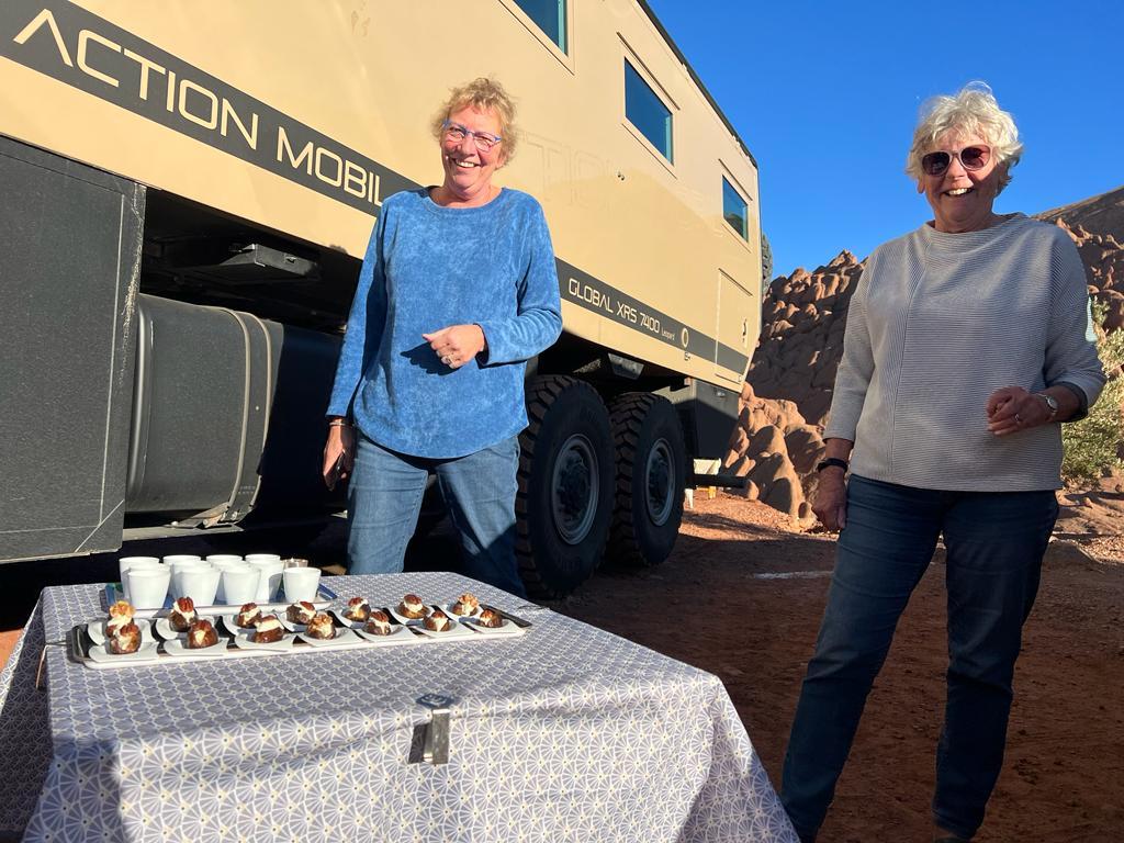 Een groot deel van de groep maakt ’s middags een stevige, drie uur durende wandeling door de kloof. Deze diehards hebben bij terugkomst wel een glaasje jägermeister en gevulde dadel verdient.