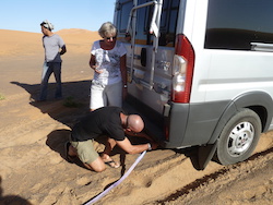 Een Marokkaanse reisorganisatie heeft op de plek die Hans en Nancy in gedachten hebben een heel wit tentenkamp gebouwd. Dat is niet de bedoeling! Er moet dus een nieuwe standplaats worden gezocht die voor alle campers bereikbaar is. Wij gaan met onze “kleine camper” eerst. Als wij het halen kunnen de andere Fiat Ducato’s volgen. Helaas, het zand is te zacht en wij zakken erin weg.