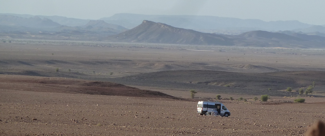 In de buurt van Taouz rijden we via een piste met elkaar 6 km de steenwoestijn in. Ver van de verharde weg, in echte stilte en met een stralende sterrenhemel boven onze geïmproviseerde buitendouche duiken wij schoongewassen het bed in.