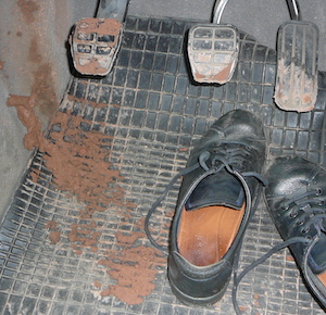 De regen valt nog steeds met bakken uit de hemel en de modder spat aan alle kanten langs de auto waardoor de weg steeds minder begaanbaar wordt. Jan krijgt als eerste problemen. Hij glijdt met zijn 7 tonner van de weg en hangt schuin in de berm. Een angstig moment. Gelukkig valt de camper niet om. Bertus brengt met zijn wagen Jan weer in de juiste positie.