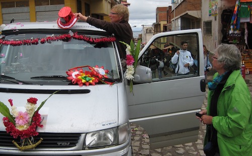 In Copacabana kun je elke morgen tussen tien en elf voor de kathedraal je auto laten inzegenen. Wij en enkele anderen willen dit ritueel ook meemaken en kopen slingers, bloemen en rozetten in de kleuren van de Boliviaanse vlag en plakken die op de auto.