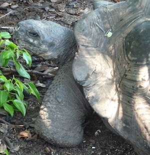 Tijdens onze rondtocht door het opvangcentrum zagen we een reuze schildpad met zeer veel moeite een vrouwtje beklimmen. Het vrouwtje was onwelwillend en sleepte het mannetje langzaam de bosjes in waar hij vast kwam te zitten tussen de takken van een boom. Maar hij zette door, daarbij gadegeslagen door een groep toeristen. Arme schildpad.