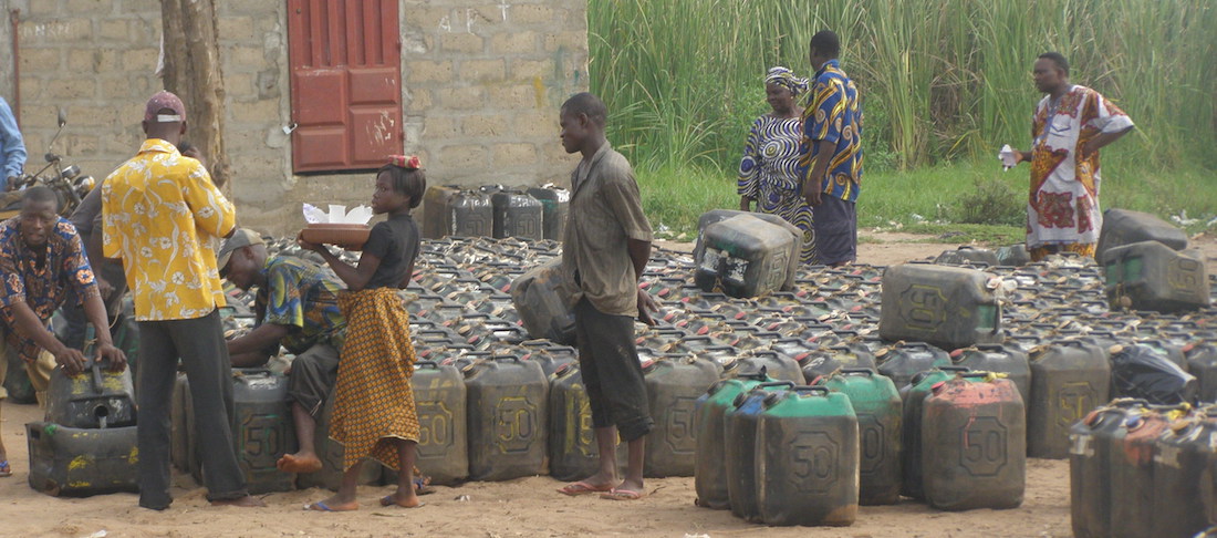 In de haven liggen honderden plastic jerrycans gevuld met benzine. We mogen geen foto’s maken want hier speelt zich de illegale handel in diesel en benzine af. Vanaf deze plek worden de dorpen bevoorraad. De plaatselijke bevolking giet de benzine over in flessen en kleine jerrycans en handelaren staan klaar om deze weer langs de weg te verkopen.