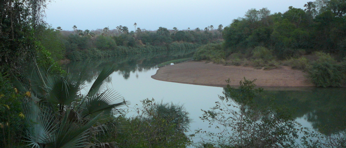 Onze gids neemt ons mee naar de mooiste uitzichtplekken aan de Gambia-rivier. Krokodillen en nijlpaarden liggen her en der verspreid langs en in het water. Bruggen over de Gambia-rivier zijn er niet. De verbinding over het water wordt gemaakt met aan elkaar vastgeknoopte boomstammen waardoor de weg naar Gambia bereikbaar is. Als je hier geen 4×4 hebt, kom je niet ver.